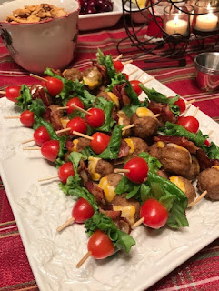 But you can pretty much put these together without a real recipe, as they're simply frozen meatballs (cooked, of course), topped with squares of cheese, then bacon, lettuce and grape tomatoes. I'll be truthful here, these ARE a little fussy, because you have to cook the meatballs and then cook the bacon separately, which is time consuming. But, you could easily do at least the bacon ahead of time, as it's not crucial that the bacon is piping hot.
